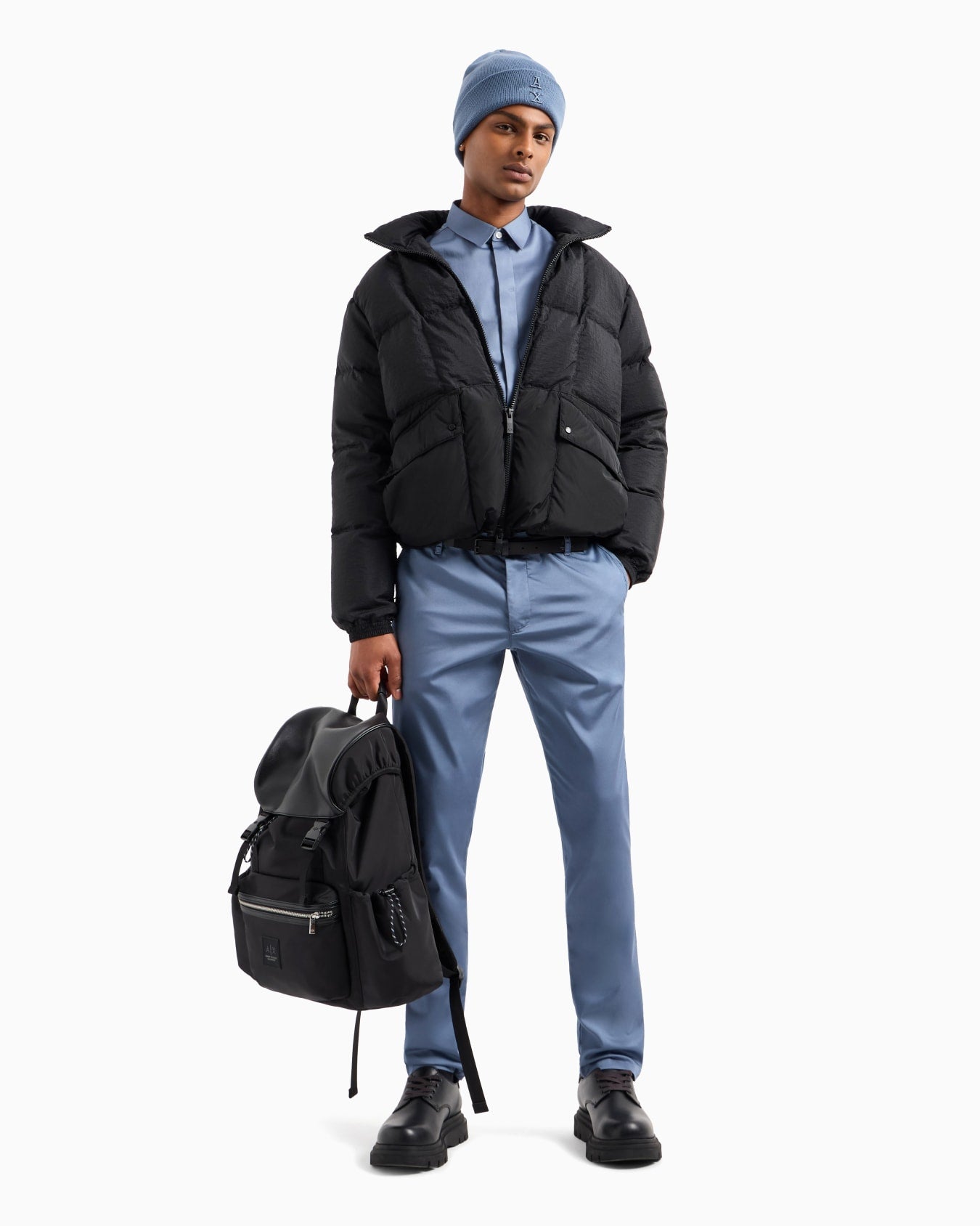 Trousers made of cotton gabardine and characterized by an elastic waist and a vertical stitching in tone that follows the leg. The side and back pockets with button complete the design.