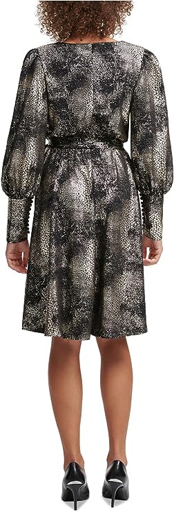Calvin Klein Foil-Printed Wide Sleeve V-Neck Belted Dress Color Black Size 14