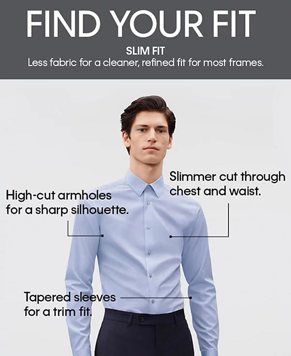 A slim fit is cut closer through the chest, sleeves and waist; features slim armholes and sleeves