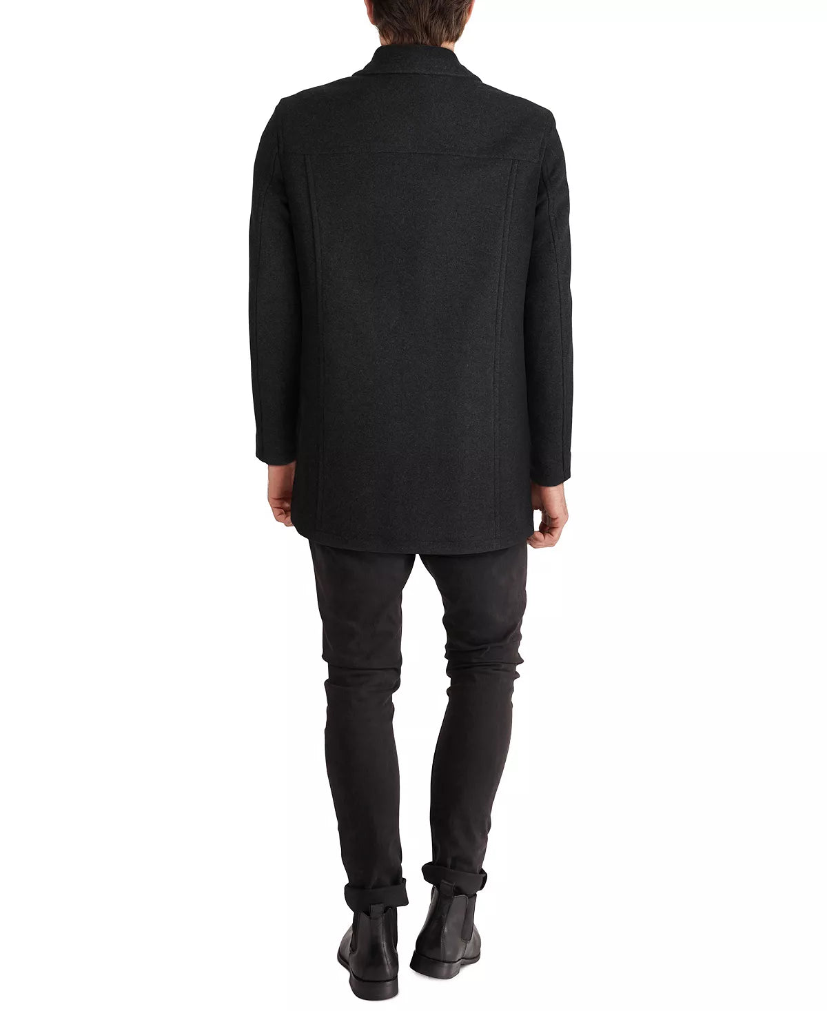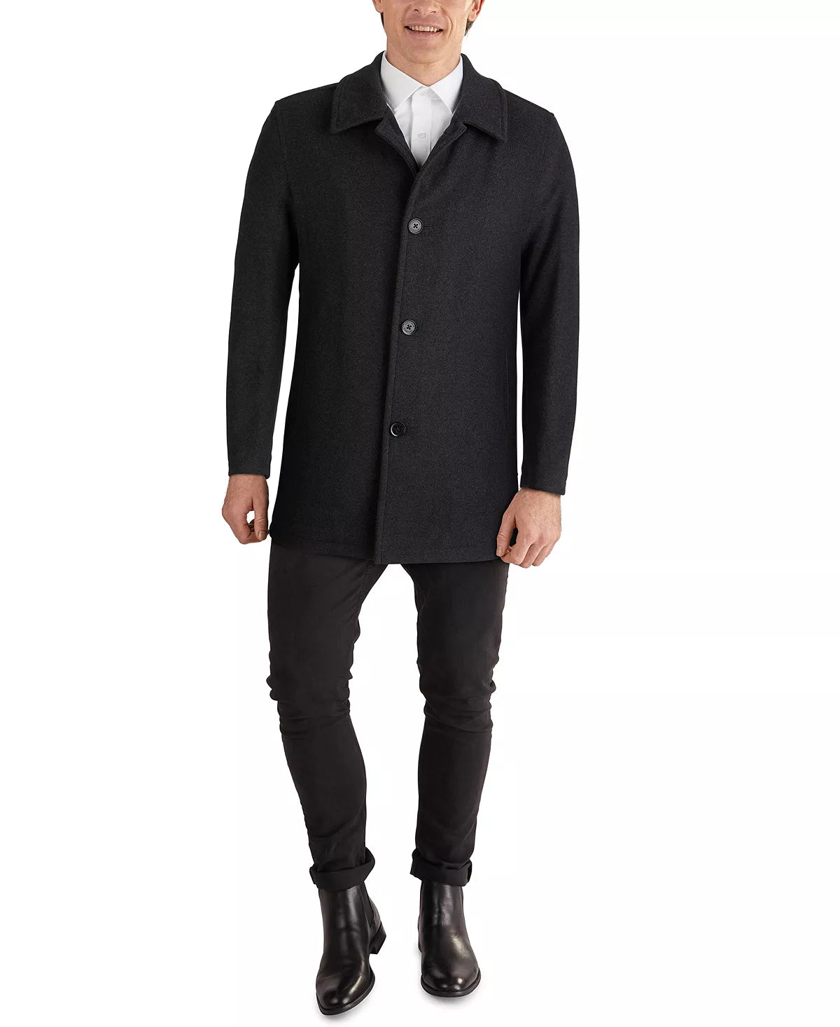 Keep your cold-weather look classic with the clean lines and polished faux-leather trim of this car coat from Cole Haan.