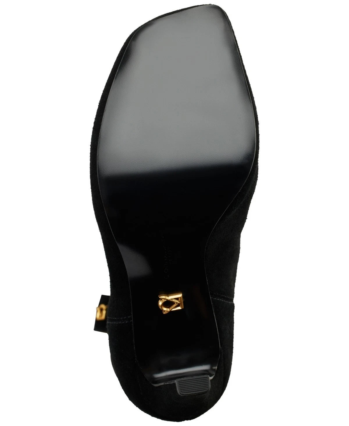 Square toes and stiletto heels elevate slouching shafts for a fresh pull-on look in the Donna Karan New York Donna boots.