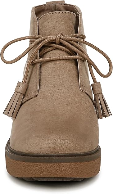 Women's wedge booties with a wow-now design. CRAFTED: Linings and topcloth; toe box and heel counter. MATERIALS: Microfiber or polyester/wool blend upper. FIT: Lace up closure for a secure fit. COMFORT: Anti-odor Insole Technology with cushioning, comfort, and support that uses cushy BLOOM® foam insole. STYLE: Wedge lace up bootie with playful tassel details and 3-inch gum sole wedge heel and 1-inch platform. Wear-everywhere ankle boots with a trending gum sole packed with comfort and cuteness.
