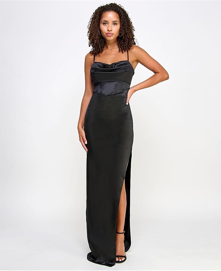 Emerald Sundae Juniors Drape-Front Long Sateen Gown Color Black Size M