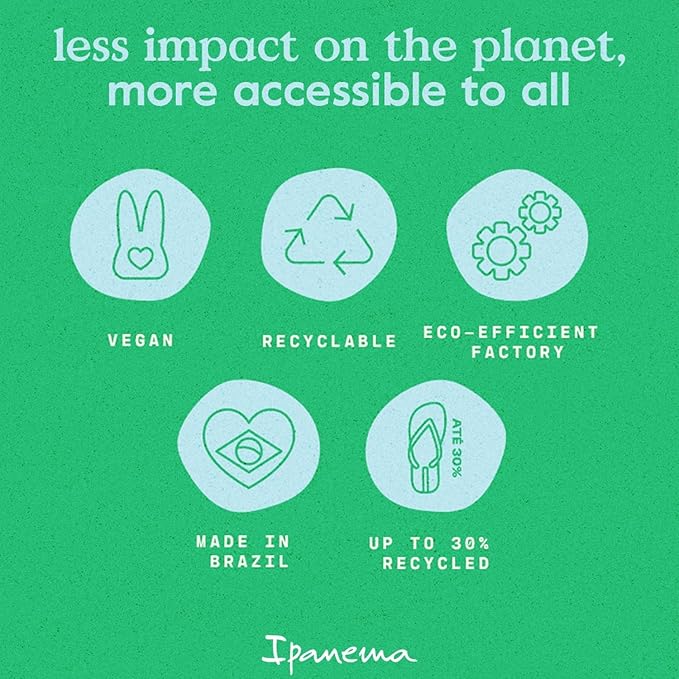 VEGAN & ECO-CONSCIOUS: All Ipanema footwear is vegan, 100% recyclable, made from up to 30% pre-consumer recycled material, and manufactured in Brazil. Our eco-efficient factories work with zero waste through our use of biodigesters, and socio-environmental responsibility is at the forefront of our operations.