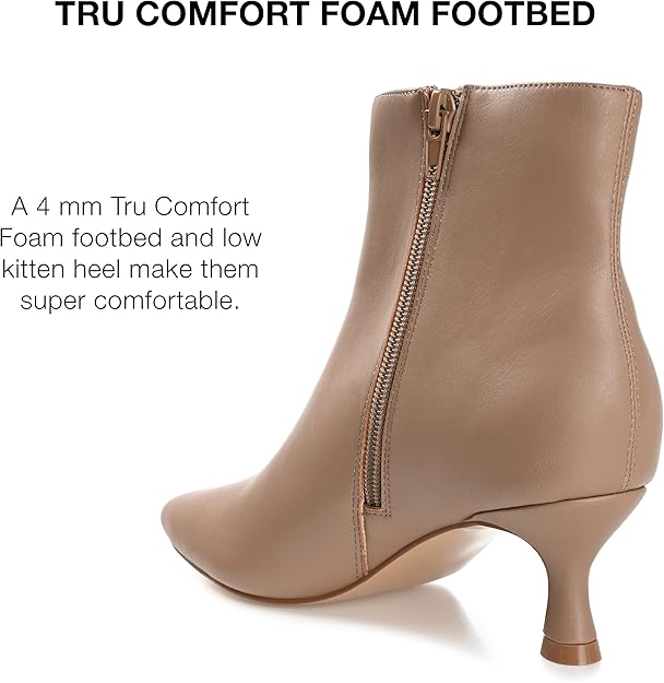 This kitten-heeled bootie is the definition of retro chic, thanks to the subtle zipper entry and square-toe. ♥ Upper Material: Vegan Leather ♥ Lining: Man-Made ♥ Toe Style: Square ♥ Heel Height/Type: 2- in Kitten ♥ Closure Type: Zipper ♥ Shoe Width: Medium ♥ Footbed: 4 mm Tru Comfort Foam ♥ All measurements are approximate and were taken using a size 6. Please note measurements may vary slightly by size.
