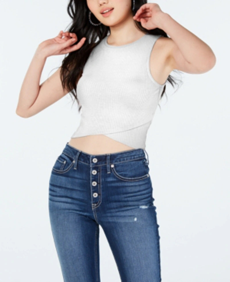 A tulip hem and a cropped length add modern style to Just Polly's classic tank top, finished in rib-knit fabric.