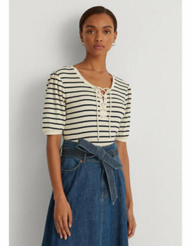 Lauren Ralph Lauren Striped Waffle-Knit Puff-Sleeve Top Color Natural Size S