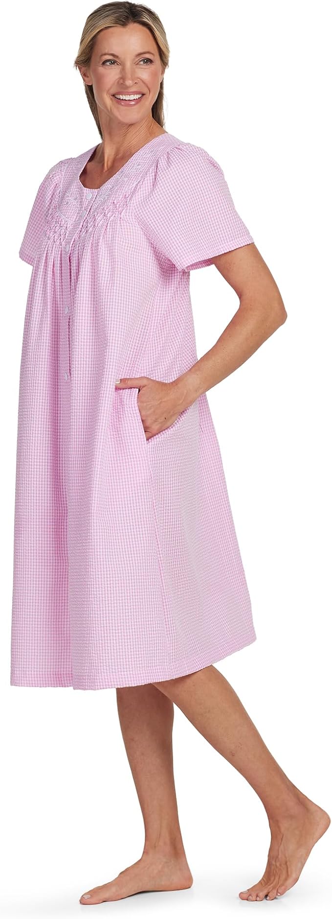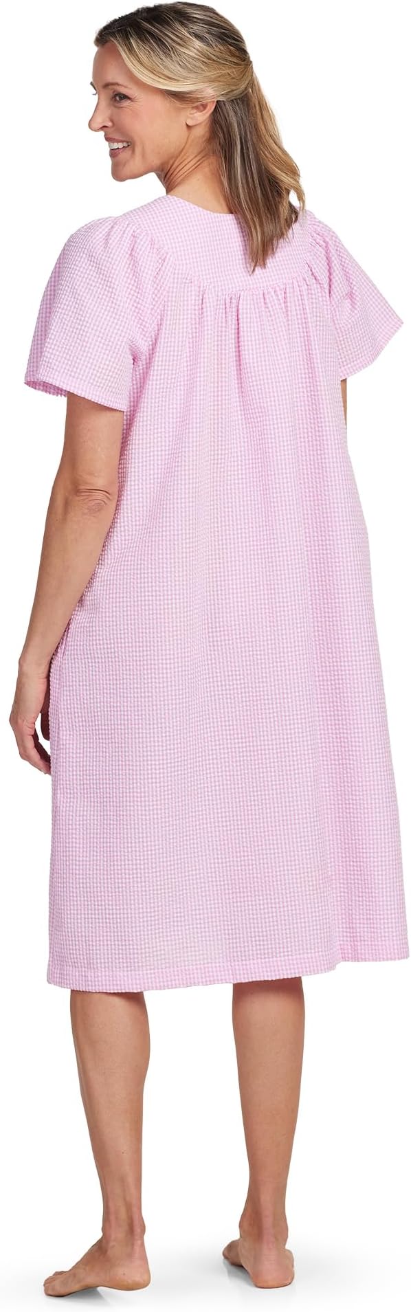 Miss Elaine Women's Short Seersucker Loungewear Robe Pink White Check Size S
