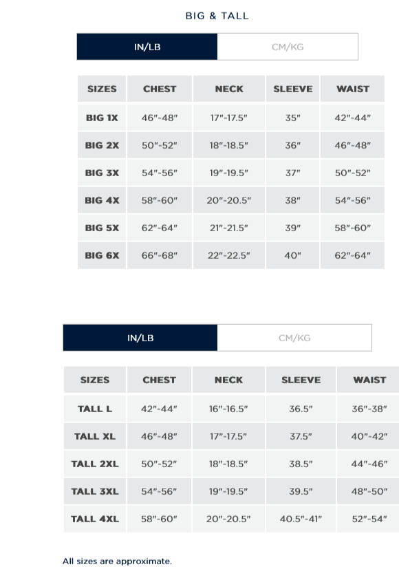 Size Tall 2L has a 33" body length (front and back), a 22" shoulder, and a 56" chest.