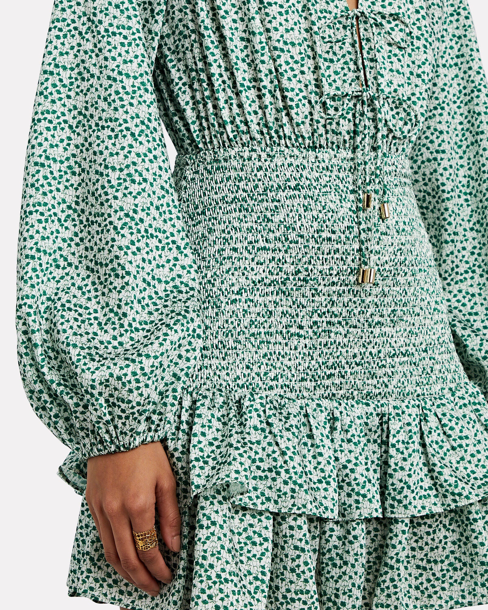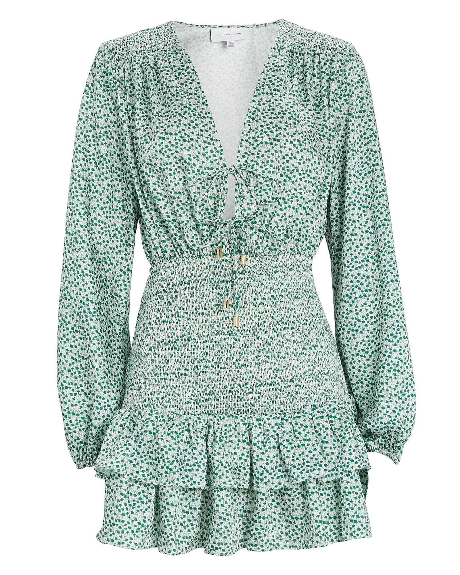 Our pick for weekend brunch, the label's Hedi floral mini dress has billowy puff sleeves and smocked hips that give way to a ruffle hem. Tie V-neckline. Elasticized cuffs. Pull-over style.
