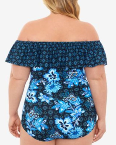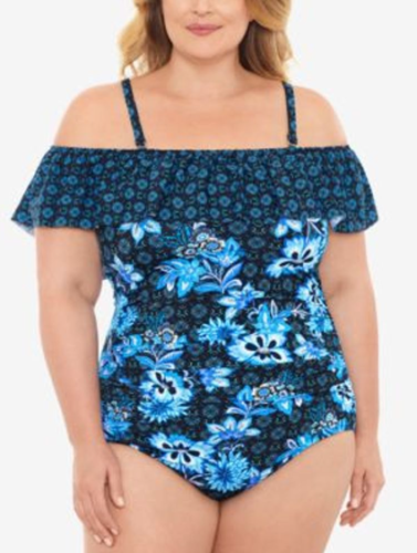 A mix of coordinating prints tops the ruffled off-the-shoulder style of Swim Solutions' plus size one-piece with tummy control to help slim your shape. Non-removable cups. Moderate bottom coverage. Tummy control. Pull-on styling; adjustable straps. Off-the-shoulder neckline with contrast ruffled trim. Pleated detail across the front.