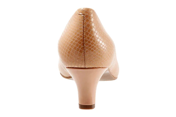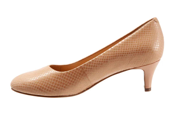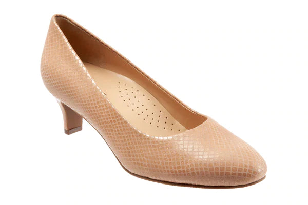 Perfect for the workweek, the women's Trotters Fab pump sits on a low pump for easy to wear comfort. The leather upper features an almond toe for added elegance. The removable footbed accommodates custom orthotics, and the durable outsole provides traction and stability.